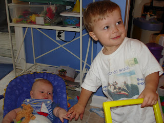 Today we had Kristin and Little Pete over for dinner. The boys seemed to play a little better today. Mario was slightly less aggressive and Pete is good at standing his own ground if he wants something. Pete is very interested in Joey, who he calls Jo Jo. He likes to point out his eyes, but we thought it was safer if he held Joey's hand instead. Joey likes Pete a lot too!